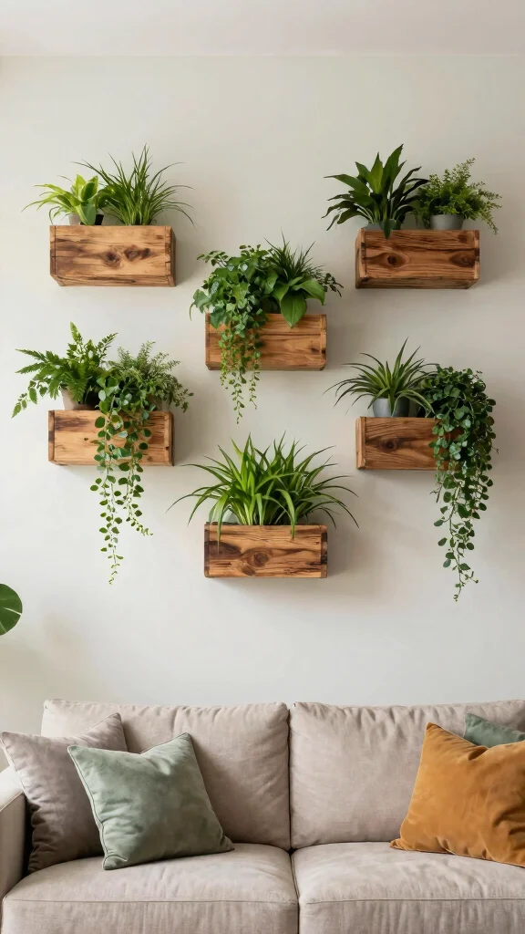 For an impactful arrangement, consider vertical designs that maximize space and create a stunning visual effect. Ensure you choose plants that thrive in your living room’s light conditions. Pair your wall planters with complementary wall art for a cohesive look.