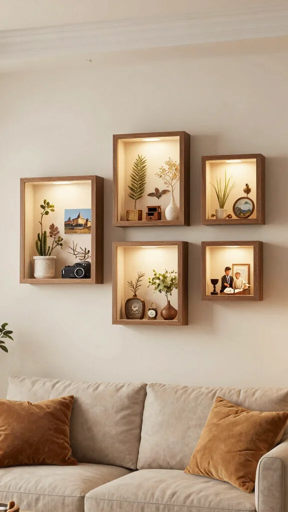 Shadow boxes turn memories into art—try layering recycled keepsakes with different depths and soft backlighting. It’s a simple, eco-friendly way to create a personal focal point in your wall art ideas living room, without buying new decor.