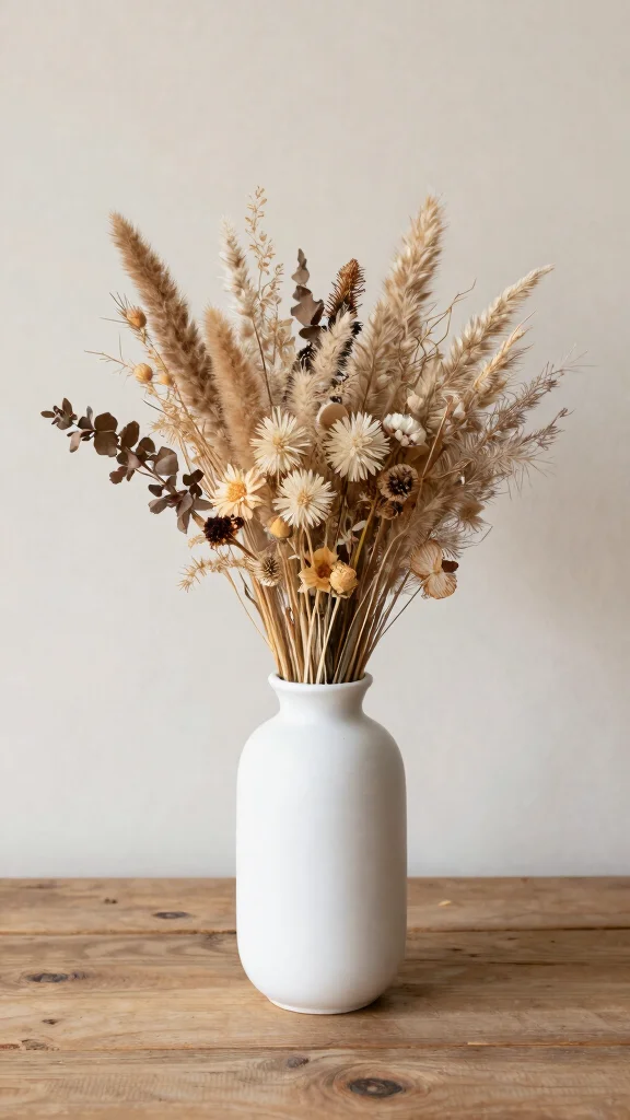 Fun fact: Dried floral arrangements in white vases can stay vibrant for 6–12 months with just occasional dusting—no wilting or water required. This makes white vase decor ideas practical for small spaces, offering texture and height with minimal effort.